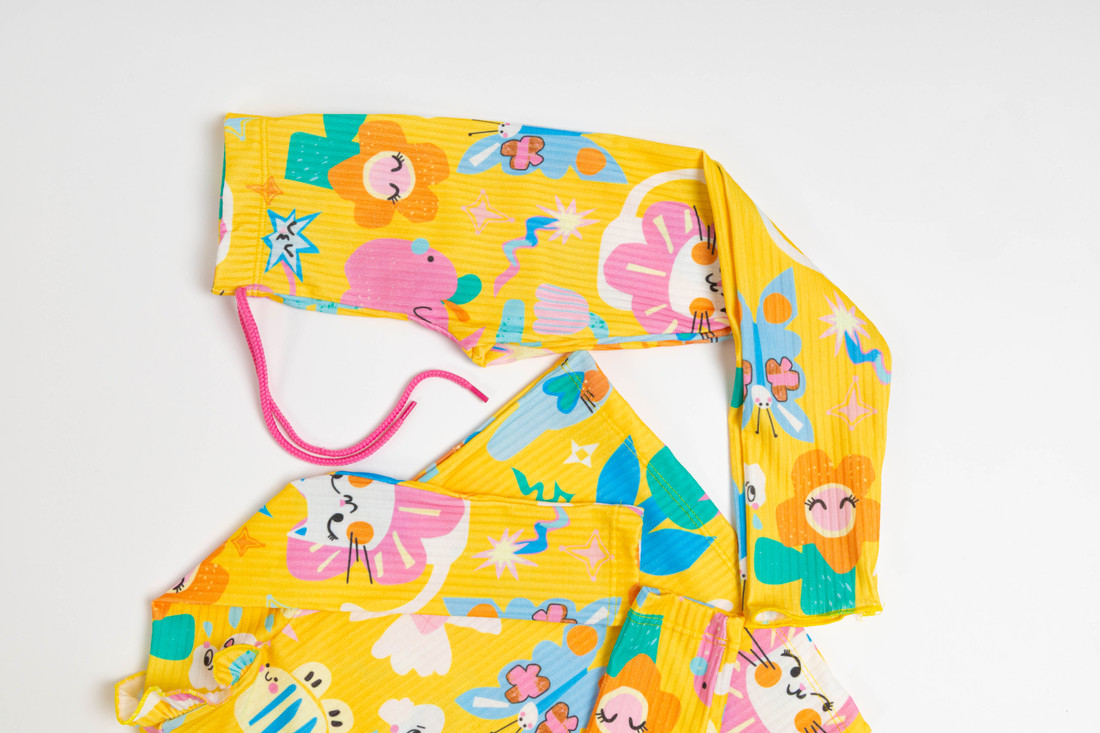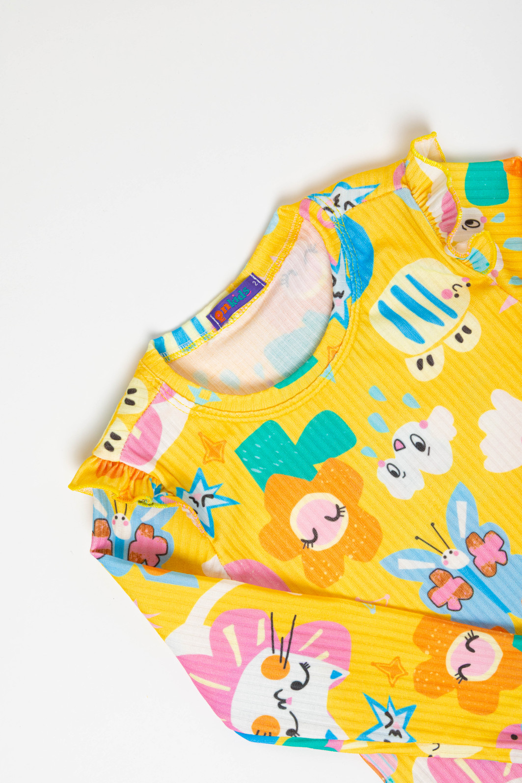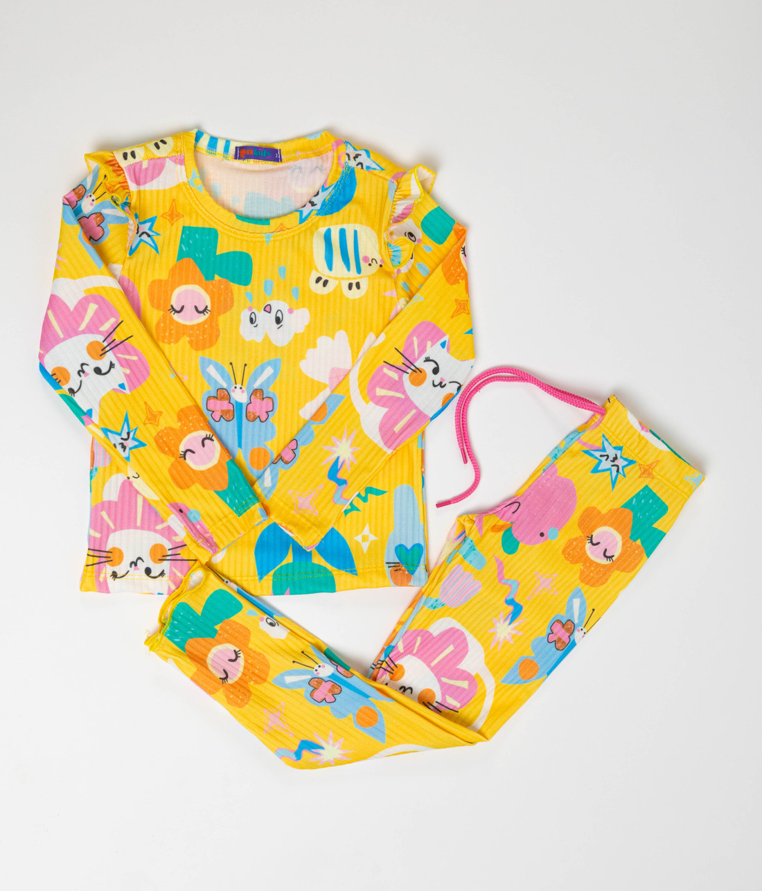 A calça complementa o conjunto com um cordão colorido decorativo e detalhes de frufru no acabamento das pernas, garantindo um ajuste confortável e um estilo único,e com elástico na cintura, o que da praticidade e conforto. Ideal para todas as estações, este conjunto é uma escolha encantadora para crianças cheias de energia e estilo.