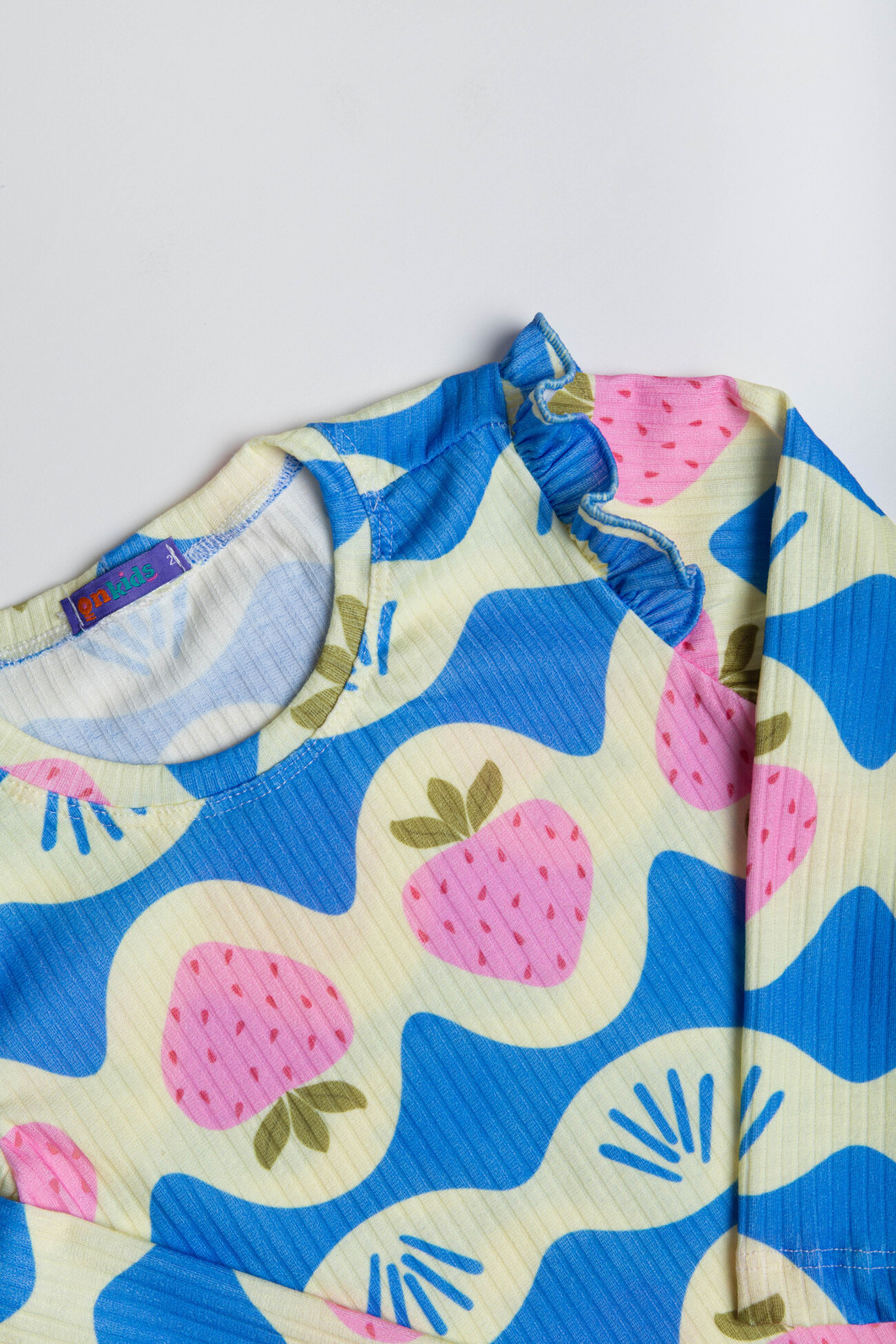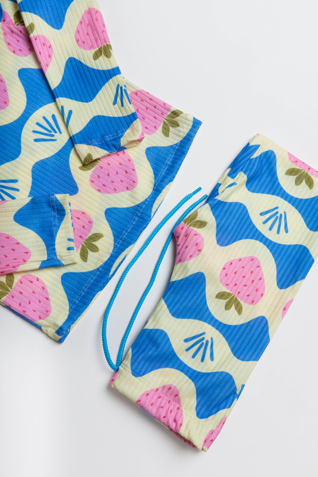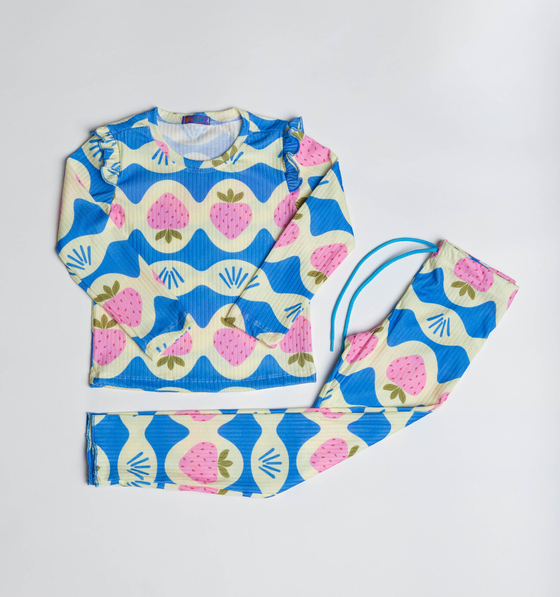 A calça complementa o conjunto com um cordão colorido decorativo e detalhes de frufru no acabamento das pernas, garantindo um ajuste confortável e um estilo único,e com elástico na cintura, o que da praticidade e conforto. Ideal para todas as estações, este conjunto é uma escolha encantadora para crianças cheias de energia e estilo.
