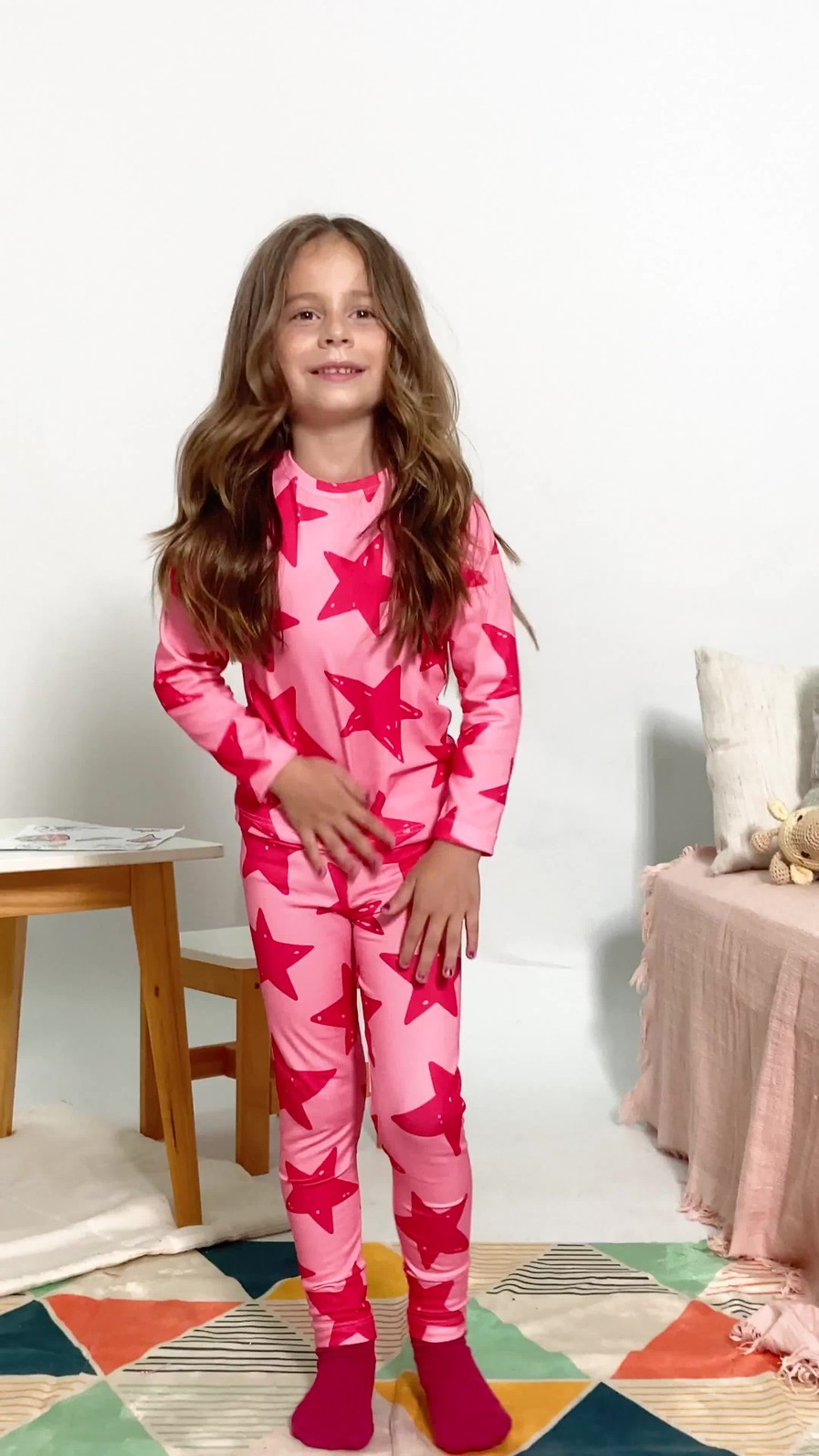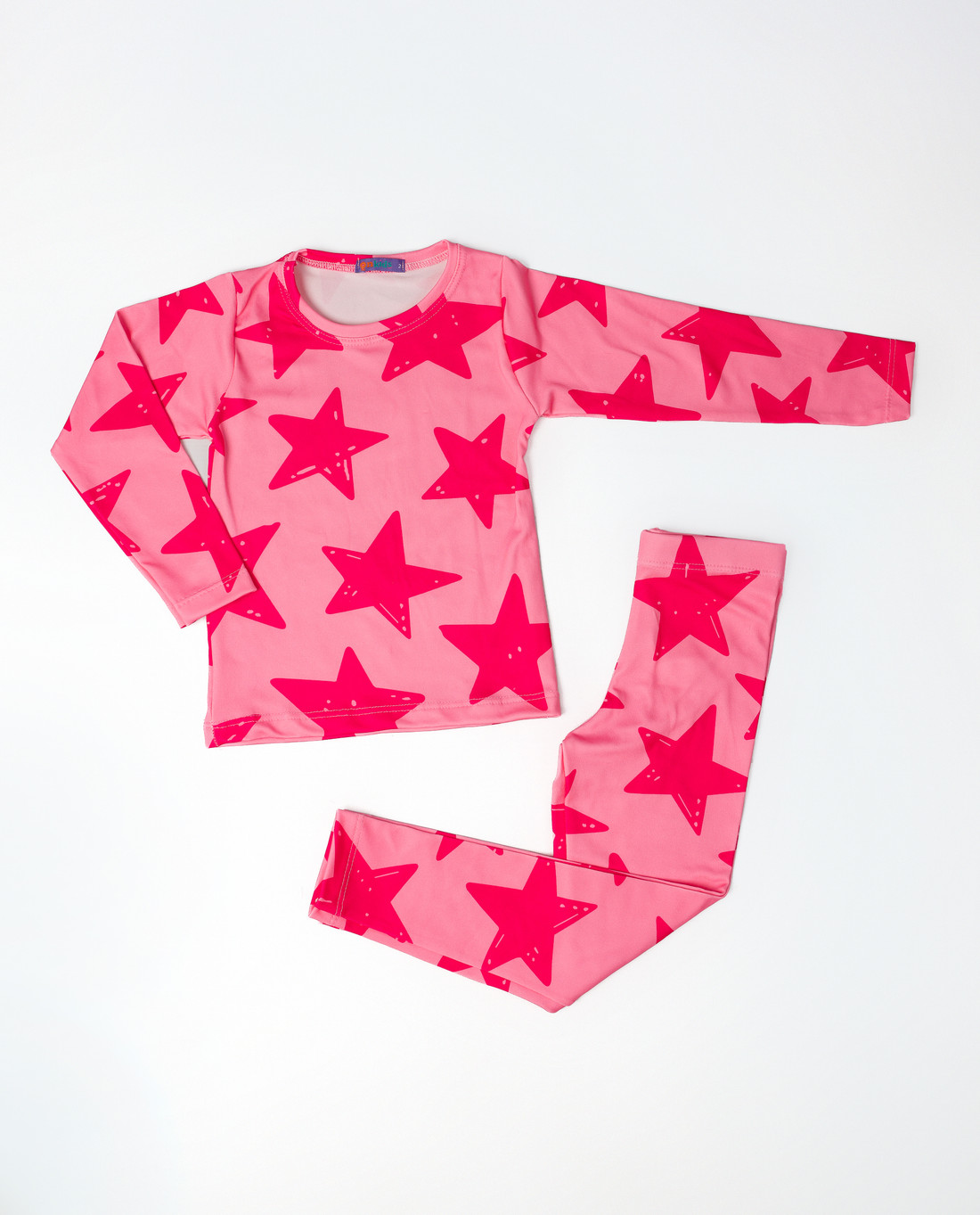 O tecido é em suplex com bastante elastano, então estica super bem e acompanha todos os movimentos da criança — seja brincando, pulando, desenhando ou até na hora de dormir. Não aperta, não incomoda e veste com facilidade, do jeitinho que a gente ama no dia a dia corrido.